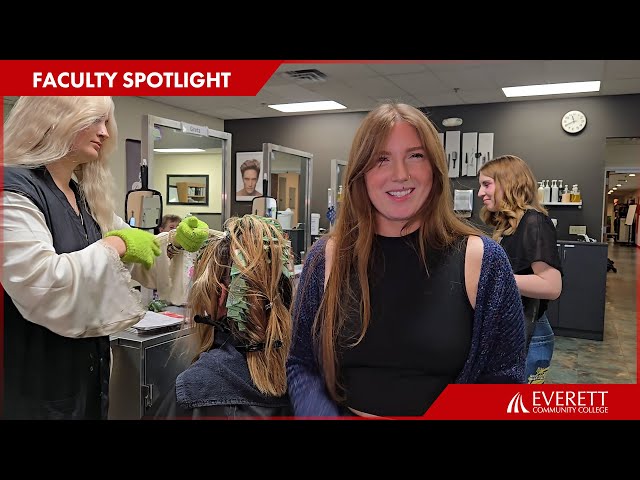 Everett Community College Cosmetology instructor, Tara Murphy, who has been a licensed cosmetologist for 19 years and an instructor for 15, teaches all classes within the college's cosmetology program. Starting as associate faculty, she earned her senior associate status and was awarded tenure three years ago. “I chose EvCC because of the amount of resources available to help students,” she said. With a background primarily in barbershops, she emphasizes that cosmetology is more than just working behind the chair. In her free time, she enjoys traveling, practicing yoga, and learning new things — and she never says no to a good snack of popcorn.