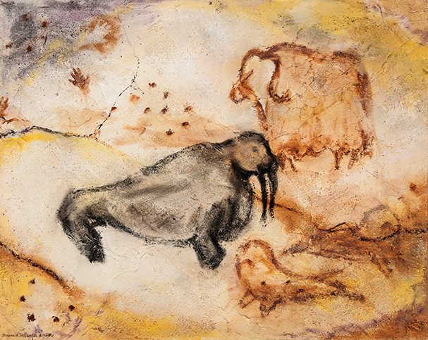 I was inspired by cave paintings, art created by indigenous people, and by Alaskan heritage. I used acrylic gels to adhere textures to the canvas like sand and torn paper and painted with oil paints.