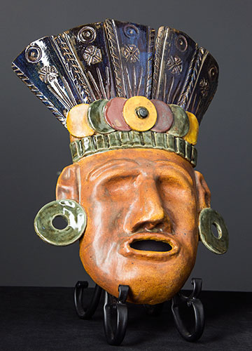 Most of my work is based on indigenous cultures which connects me to the past. This piece represents the Mayan Shamanic tradition. This is a replica of a wooden shaman, made with slabs of clay, carved then glazed with earth tones glazes.